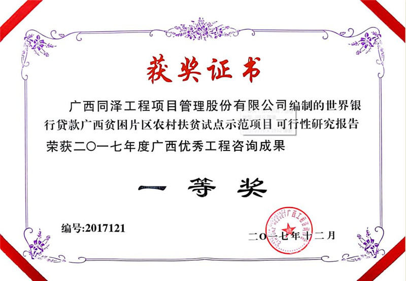 世辦銀行貸款廣西貧困片區(qū)農(nóng)村扶貧試點(diǎn)示范項(xiàng)目可行性研究報(bào)告榮獲2017年度廣西優(yōu)秀工程咨詢(xún)成果一等獎(jiǎng)