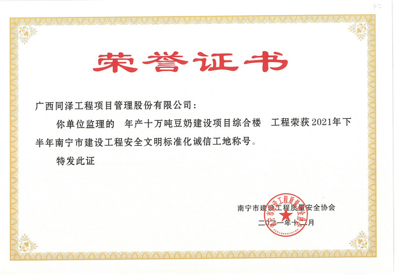 年產(chǎn)十萬(wàn)噸豆奶建設(shè)項(xiàng)目綜合樓項(xiàng)目榮獲2021年下半年南寧市建設(shè)工程安全文明標(biāo)準(zhǔn)化誠(chéng)信工地稱(chēng)號(hào)