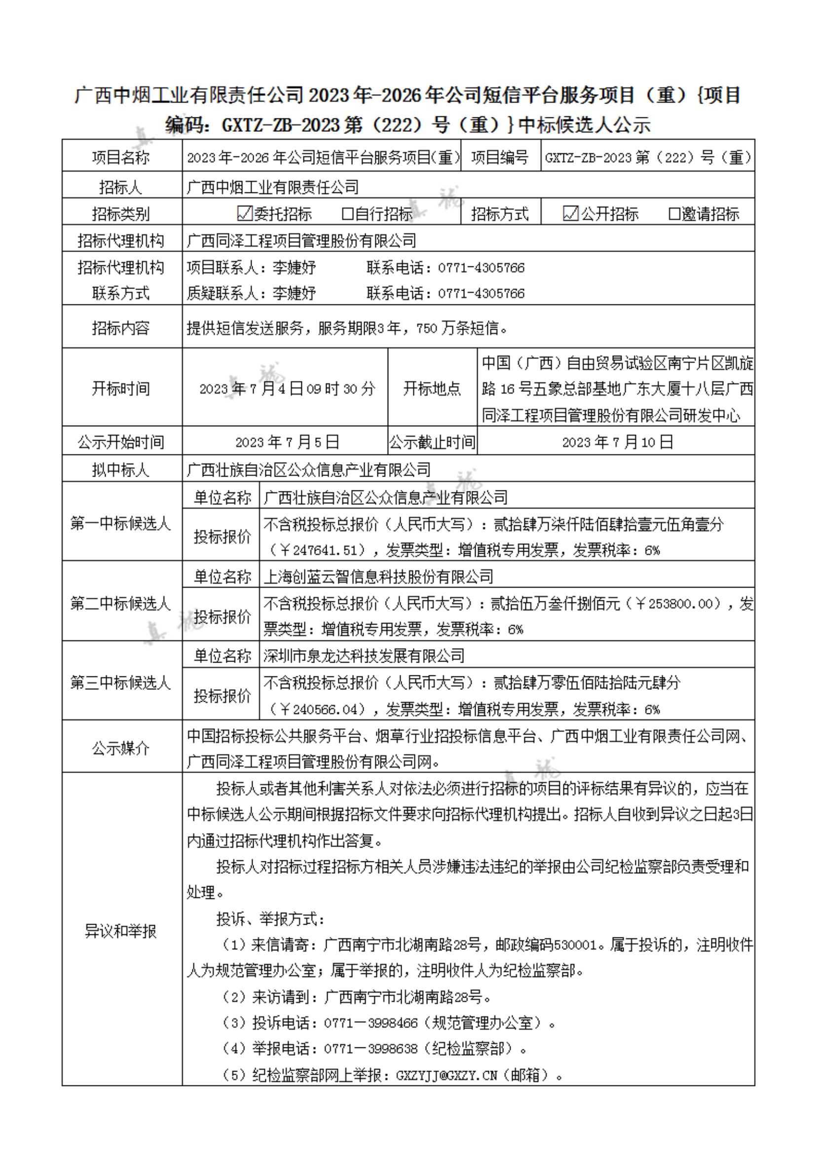 廣西中煙工業(yè)有限責任公司2023年-2026年公司短信平臺服務項目(重){項目編碼:GXTZ-ZB-2023第(222)號(重)}中標候選人公示